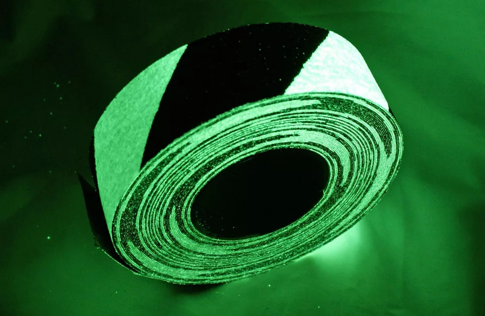 in timpul zilei, banda adeziva care straluceste in intuneric pare sa aiba o usoara nuanta verde, iar in intuneric sau in orice scenariu cu lumina neclara, emite o lumina alba stralucitoare. Banda antiderapanta postluminescenta poate fi incarcata atat cu surse de lumina naturale, cat si artificiale. Durata emisiei de lumina variaza in functie de cantitatea si intensitatea luminii incidente. De obicei, aceasta este eliberata in cateva ore. Niciunul dintre materialele fotoluminescente utilizate nu contine componente radioactive, ceea ce le face potrivite pentru utilizarea intr-o gama larga de medii.